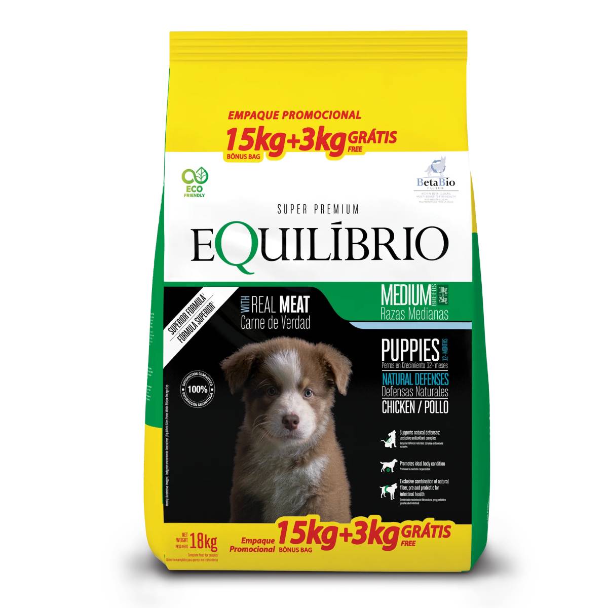 Equilibrio Cachorros con Pollo para razas medianas es un alimento completo y balanceado, ideal para perros en crecimiento de 10 a 25 kg. Refuerza el sistema inmunológico con antioxidantes naturales, apoya una condición corporal saludable y mejora la digestión gracias a su mezcla de fibra natural, prebióticos y probióticos.